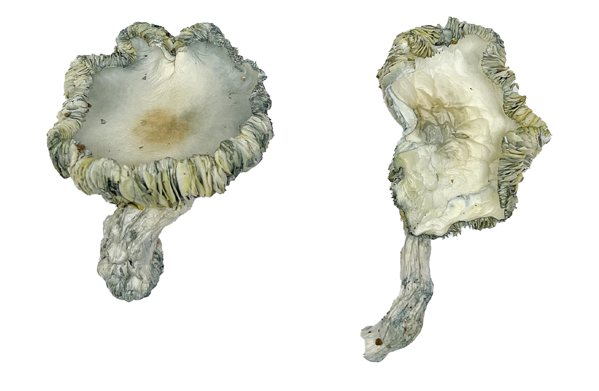This mushroom is quite unique in its physical features. Like many Albino strains expect mostly a white to grey mushroom including both the caps and the stems. The caps of ARC shrooms curl up along the edge with a proud display of its gills. The edge of the cap almost appears like coral, with intricate patterns in ghostly grey and white colors. The stem is sturdy and would be described medium to large thickness, not too tall but stout.