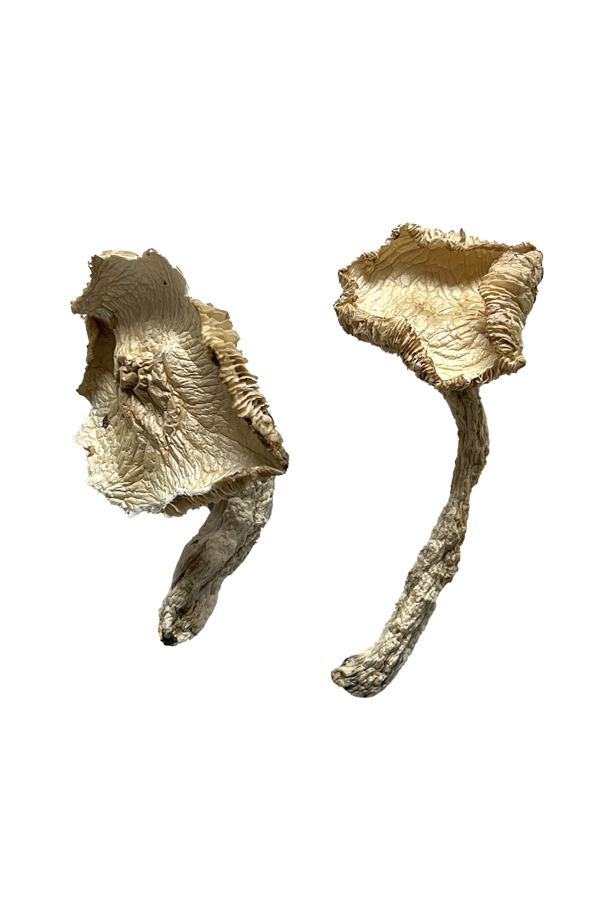 The Stakz shrooms have a unique albino appearance, the fruits tend to be large and ghostly white. The caps are medium to large and the stems are often thick. Both parents of this strain are colourless albino type of mushrooms. The caps of Stakz like to open up wide proudly showing its gills underneath the cap.
